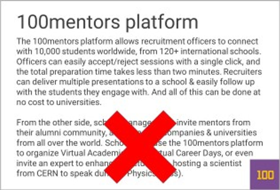 Practical example. We wanted to create a slide with the benefits Student Recruitment Officers & School managers enjoy from 100mentors. But, those are 2 messages and thus, we just kept the one (recruiters).